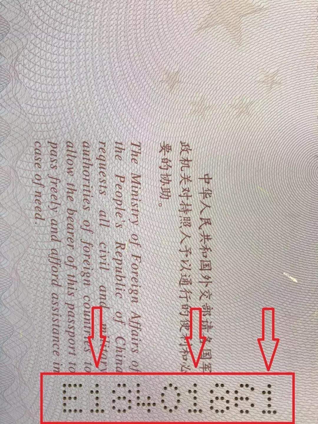 在电子普通护照页面底部,也会有镂空的护照号码,这里的护照号码一目了然。