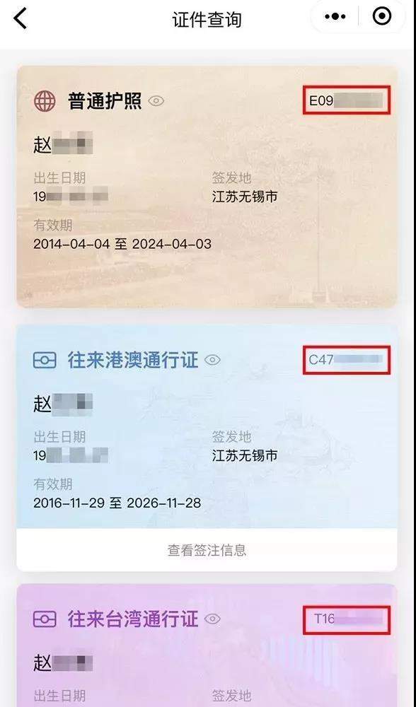 进入“小程序”后在“证件查询”中可以查询本人证件信息,里面的证件号码(不光是护照号码,还有往来港澳通行证、往来台湾通行证号码)也很好辨认。
