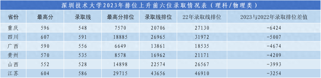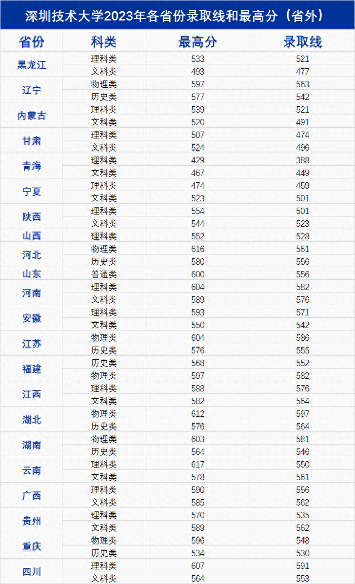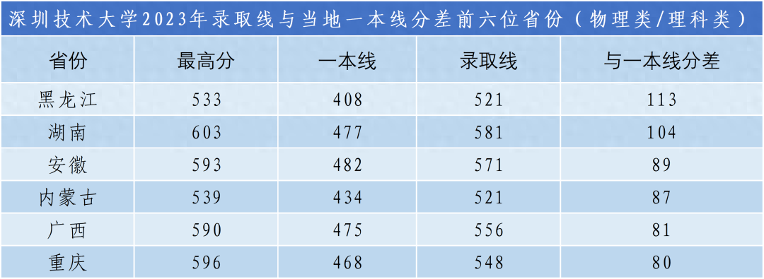 深圳技术大学省外理科录取线在普遍增加招生计划的情况下,大幅度攀升,大多高于当地一本线50分至80分录取,录取最低排位平均较去年提升2000多位。黑龙江省理科录取分数线超当地一本线113分;湖南省理科录取分数线超当地一本线104分。省外文科分数线大多高于当地一本线20分至30分录取,录取最低排位平均较去年提升600多位。