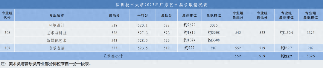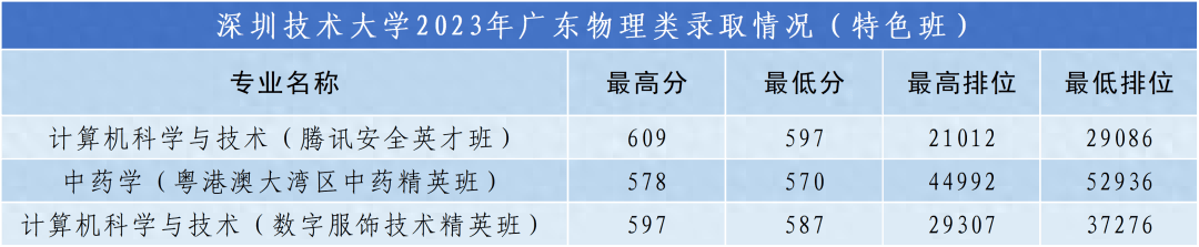 在广东省美术类招生录取线为522分,最低排位3325,列广东省本土高校第十位。美术类在录取人数较去年增加了30人的情况下,排位较去年提升613位。历史类录取线为540分,列广东本土高校第十一位,录取人数较去年增加20人。音乐类专业首年招生,录取线为519分,最低排位907。此外,深圳技术大学首年直接高考招生录取的3个特色班,也受到了考生们的青睐。