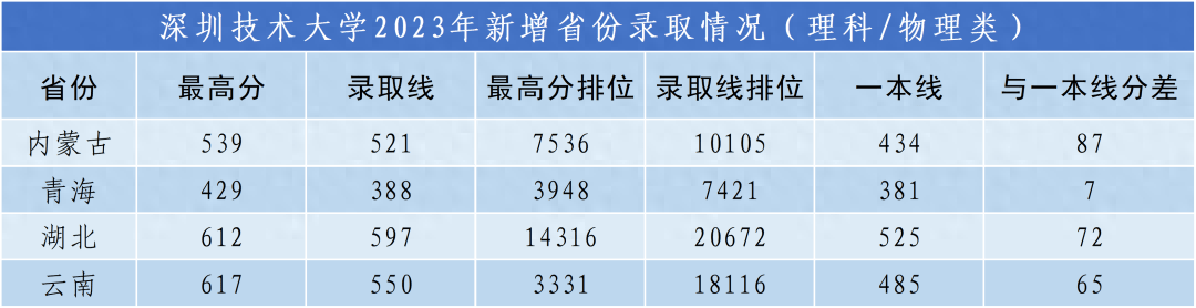 2023年深圳技术大学新增内蒙古、青海、湖北、云南4个招生省份,理科/物理类分别高于当地一本线87分、7分、72分、65分录取,文科/历史类平均高于当地一本线25分录取。