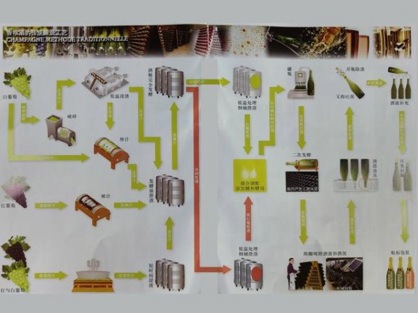 香槟、起泡酒的酿造过程:葡萄采摘→去梗破碎→浸渍→澄清→发酵→澄清→灌瓶→二次发酵→速冻处理→开瓶除渣→补充酒液→压塞封瓶→包装。图解: