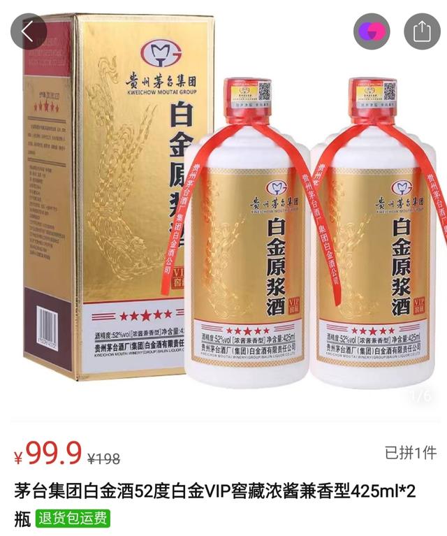 在另一电商平台,一家名为“合动力贸易酒类专营店”的店铺,白金VIP用酒的定价是499元两瓶,1299元6瓶,若买6瓶装,平均一瓶216.5元。