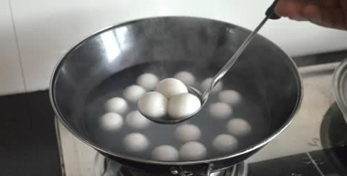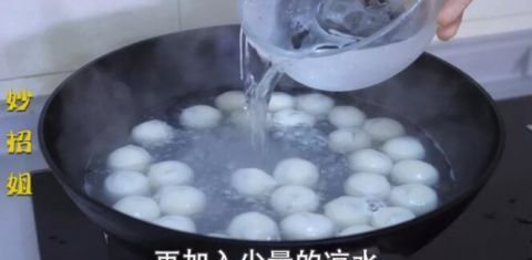 3、点冷水:煮的过程中,每开一次锅加少量冷水,使锅内的元宵保持似滚非滚状态。水沸两三次后,再煮一会儿,即可食之。这样煮出的元宵质软不硬,甜黏好吃。