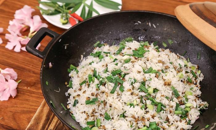 9、米饭快煮好的时候,将炒好的春菜倒入米饭中,淋上葱头油,拌匀;
