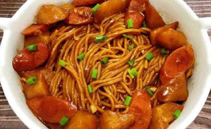 食材:土豆、火腿、面条、葱花、蒜末、生抽、老抽、蚝油、盐、白糖