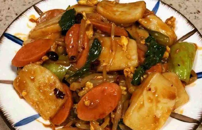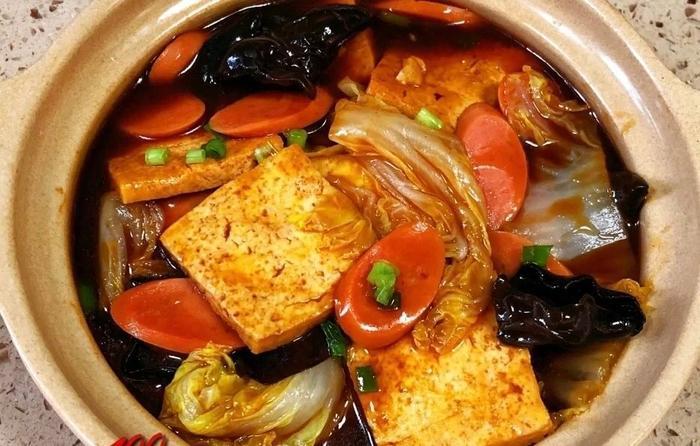 食材:白菜、老豆腐、黑木耳、火腿肠、葱蒜、生抽、老抽、蚝油、盐、鸡精