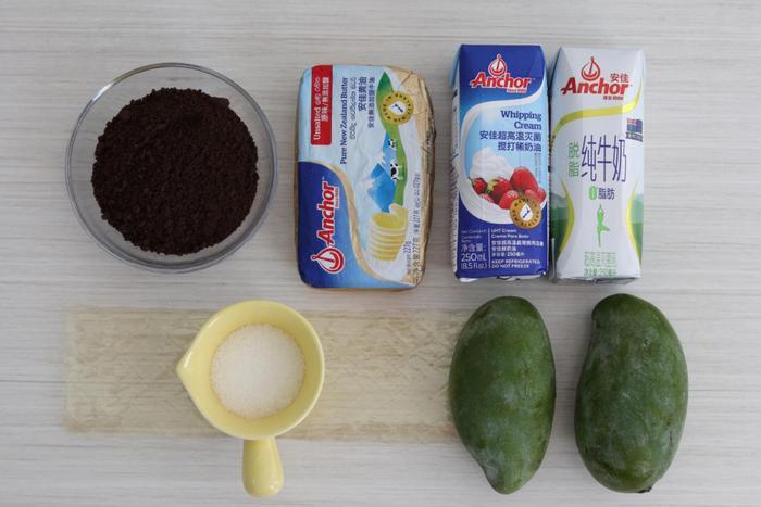 1、首先准备好要用到的食材份量,这里用到的芒果选用的是青皮芒果,饼干用的是最常吃的奥利奥饼干。