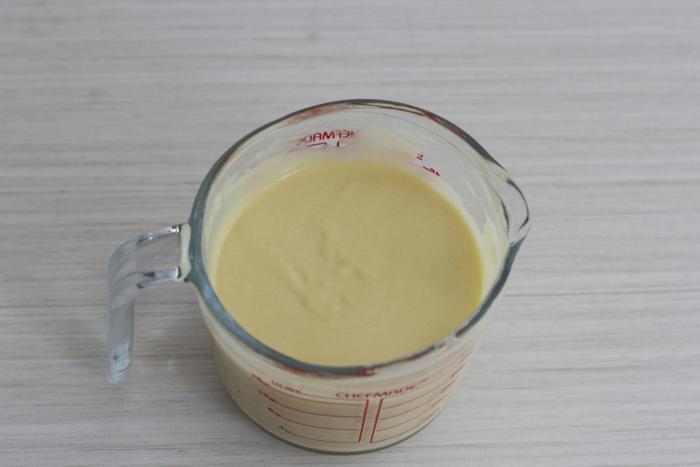 7、把打好的芒果泥和淡奶油倒在一个碗里,用勺了拌均匀后,把吉利丁液也加入其中,一起拌拌均匀后芒果慕斯糊就准备好了。