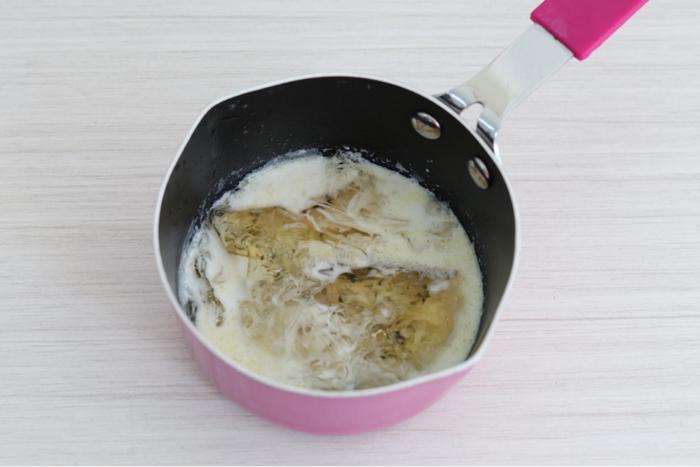 6、把30克的牛奶用小火加热到微沸时关火,等到牛奶温热时,把前面泡好的吉利丁片从水中捞出来,放进牛奶里,慢慢搅拌至均匀为止。