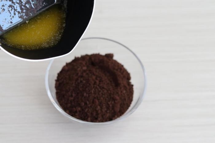 2、把备好的奥利奥饼干按到细碎后放在一个碗里备用,再把备好的黄油用小火加热的方式化成液态。把化好的黄油倒入到装有奥利奥饼干的碗里,拌均匀。