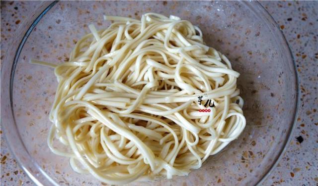 4.将面条捞起,过冷水冲凉,捞起滤干水份,再放入一勺熟油或者色拉油拌匀。