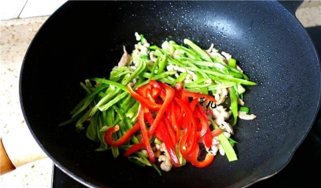 6.炒至肉丝变白放入青椒丝和甜椒丝翻炒。