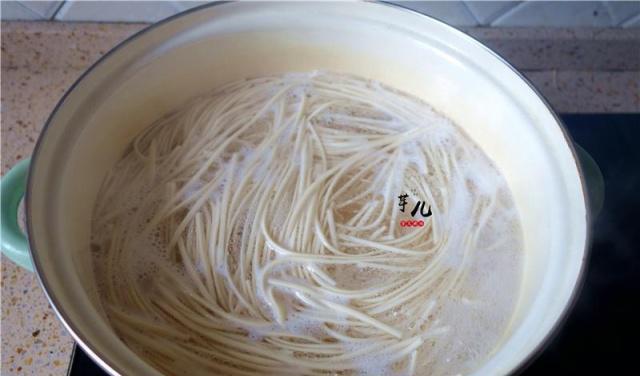 3.取一汤锅,烧半锅清水,将面条放入锅里,煮到8分熟。(煮至面条浮到水面上,试吃一小段,如果面体外熟中间略生,就是八分熟)