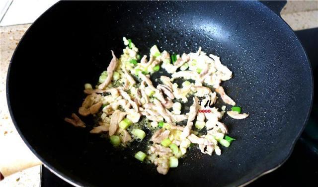 5.锅里放入适量植物油,炒至7成热,将肉丝放入锅里滑散,放入蒜末葱花炒香,翻炒均匀。