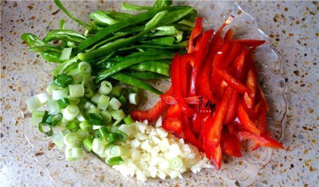 2.将青椒,甜椒大葱洗净切好备用,大蒜剁成蒜泥备用。
