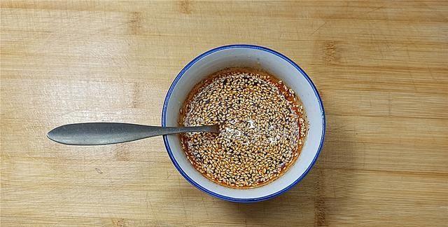 【步骤五】:等调料温度稍微下降后,依次放入白糖1勺、半勺盐、生抽2勺、辣椒面1勺、白芝麻1勺、香油1勺,搅拌均匀兑成调料汁备用。