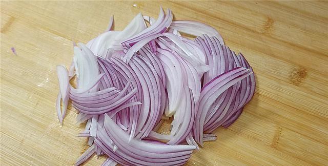 【步骤一】:先把洋葱外面的老皮剥掉,然后切头去尾,把洋葱一刀切成两半,再把洋葱切成丝,尽量把洋葱丝切细一点。