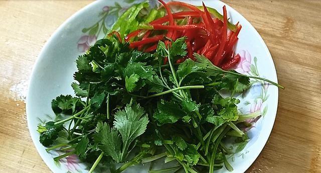 【步骤三】:把准备好的香菜摘洗干净,用刀切成寸段、青红辣椒把籽去掉后切成和洋葱粗细的丝,然后分别装盘备用。