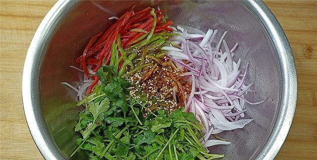 【步骤六】:把泡完的洋葱丝捞出来把水沥干放入盆子中,同时放入青红椒丝、香菜段、花生米,再倒入准备好的调料汁。