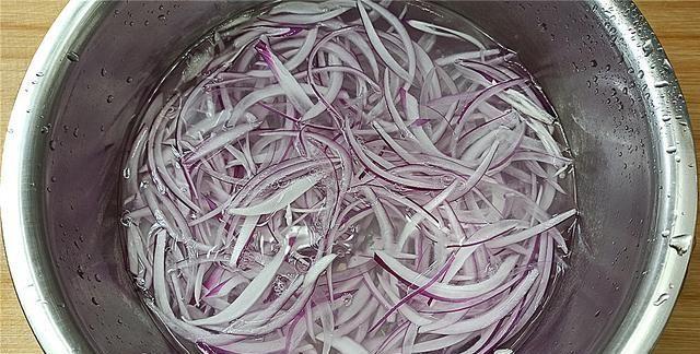 【步骤二】:把切完丝的洋葱用手抓散放入盆子中,放入2勺盐、2勺白醋,然后放水没过洋葱丝浸泡5分钟左右,主要是减少洋葱的辛辣味道,同时让洋葱提前入味。