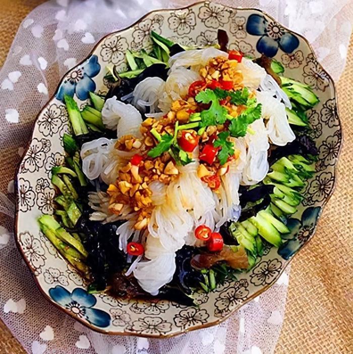 4、将木耳丝放到盘中黄瓜丝的上面。