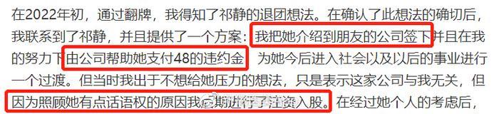 不仅介绍了工作,还帮祁静支付了丝芭传媒预估上百万的违约金,为了让祁静在新公司有话语权,大哥还亲自注资入了股。