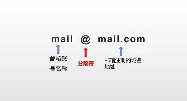 电子邮箱一般格式为:123456@mail.com,其中“123456”为注册邮箱时的注册名,可以是中文、英文、数字等。“@”为邮箱分割符;“mail”是电子邮箱的域名,如果是QQ邮箱,后缀就为123456@qq.com。