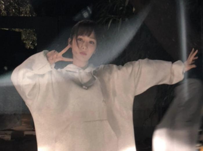 照片中黑漆漆的夜里,杨紫穿着一身白色衣服,一本正经地搞怪。她一只手平举,另一只手在脸颊旁边比耶,画风搞笑。