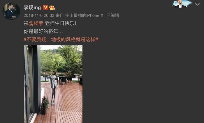 11月6日凌晨零点零五分,李现上线晒杨紫美照,并非常客气地说道:杨紫老师生日快乐!