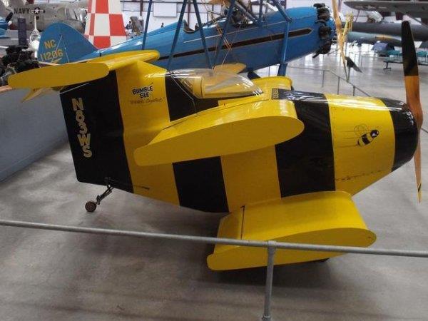 这架飞机的外表被涂成了黑黄相间的条纹状,远远的看上去就像一 只蜜蜂,因此这架飞机就被叫做“大黄蜂”。飞机的构造也不复杂,前半身采用了老式飞机的双翼结构,飞机的尾巴上则采用了T字形的尾翼布局方式。前置双叶螺旋桨,引擎内置在飞机的机头部位,起落架则是前面两个大,后面一个小的不可收缩外置起落架。飞机的驾驶舱位十分的小,只能容纳一个体型正常的成年人来驾驶。