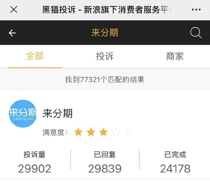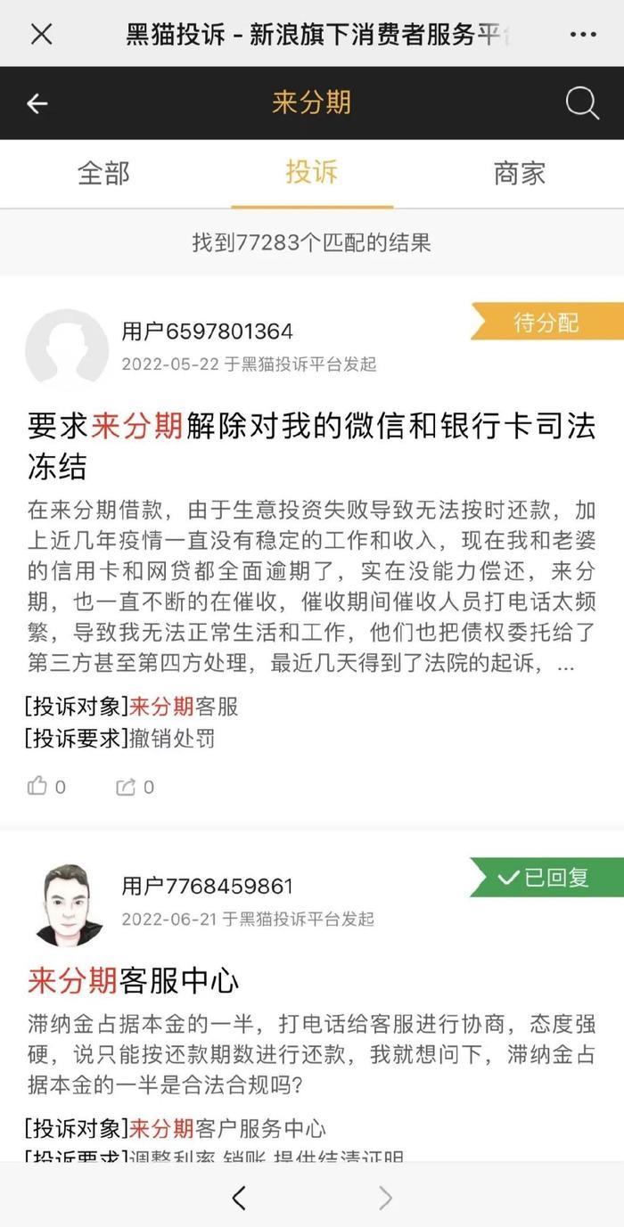 截至目前,在黑猫投诉平台搜索“来分期”有近三万投诉,依然有5000个投诉未处理,其他投诉平台未做统计,争议纠纷远不止于此。