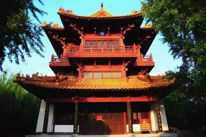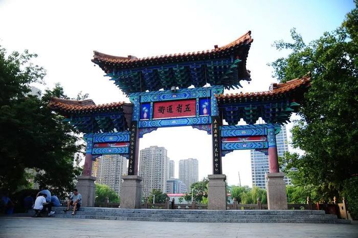 黄楼公园园内矗立着一座重建的牌楼,黄色琉璃瓦封顶,四角飞檐下吊系铜铃,朱红圆柱上端有雕花彩绘的斗拱和檩,中悬横匾,横额上一面书有“五省通衢”,另一面是“大河前横”。