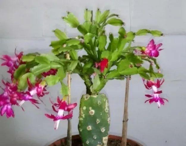 这是在单层嫁接法的基础上,增加了嫁接的层数和方位,可以让蟹爪兰在仙人掌上形成多层多方向的花束,效果更加壮观。