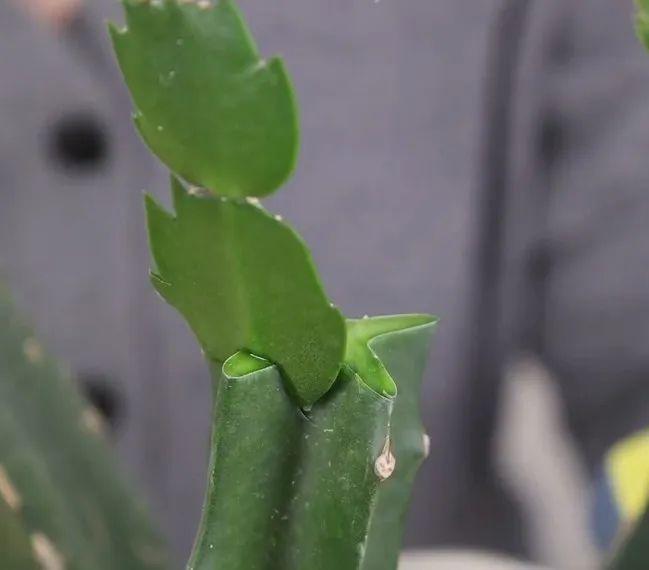 把蟹爪兰的削面插入仙人掌的切口里,尽量贴紧,不要让伤口暴露在外面。
