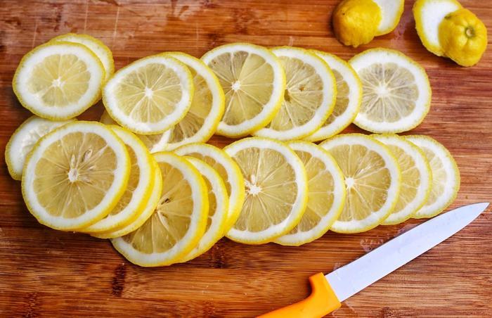 3、清洗干净的柠檬,去掉表面的水分,再将柠檬籽去掉,然后切成片备用。
