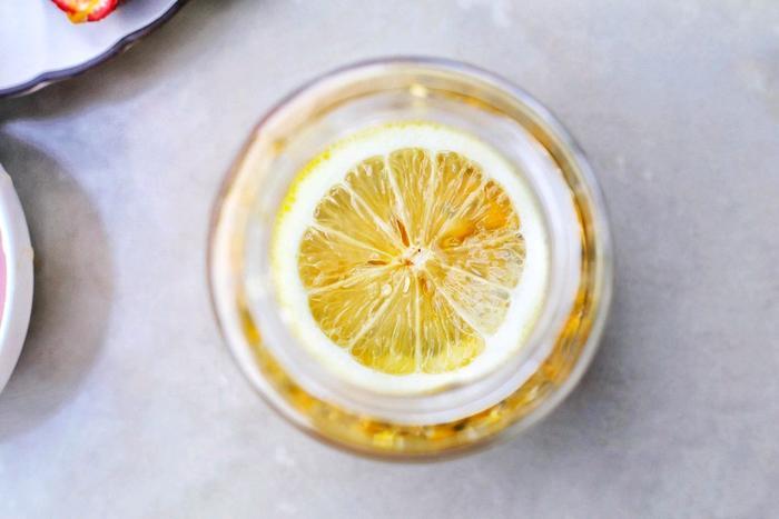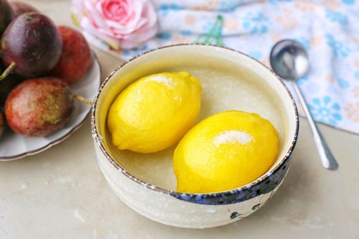 2、柠檬用盐搓干净表皮,洗干净之后的柠檬泡在清水中浸泡一下,这样操作能够把柠檬表面的蜡去掉。