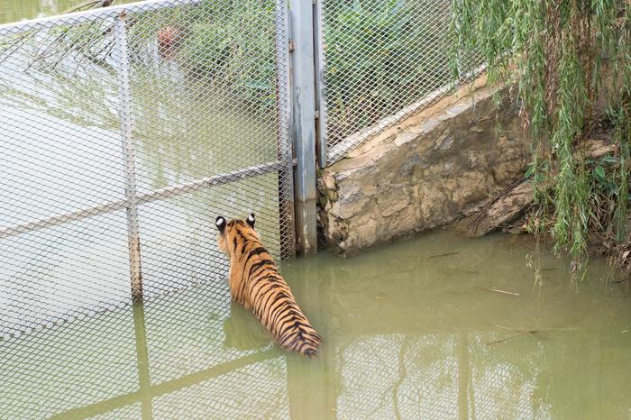 这里的老虎生存欢快也不错,不仅有丛林还有河流,天气如果比较热的话,它们会跑到水里戏水,大太阳的时候则会躲在灌木丛中,非常有趣。