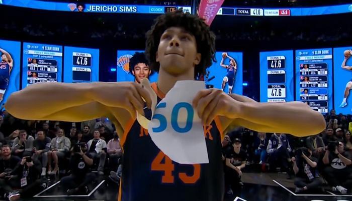 希姆斯一整只手臂挂臂,拿下篮网下面的纸,上面写的是50,最后平均分是47.8分;