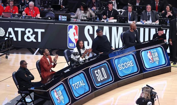 扣篮大赛的评委:克劳福德、莱斯利、卡尔-马龙、哈罗德-迈纳、多米尼克-威尔金斯;