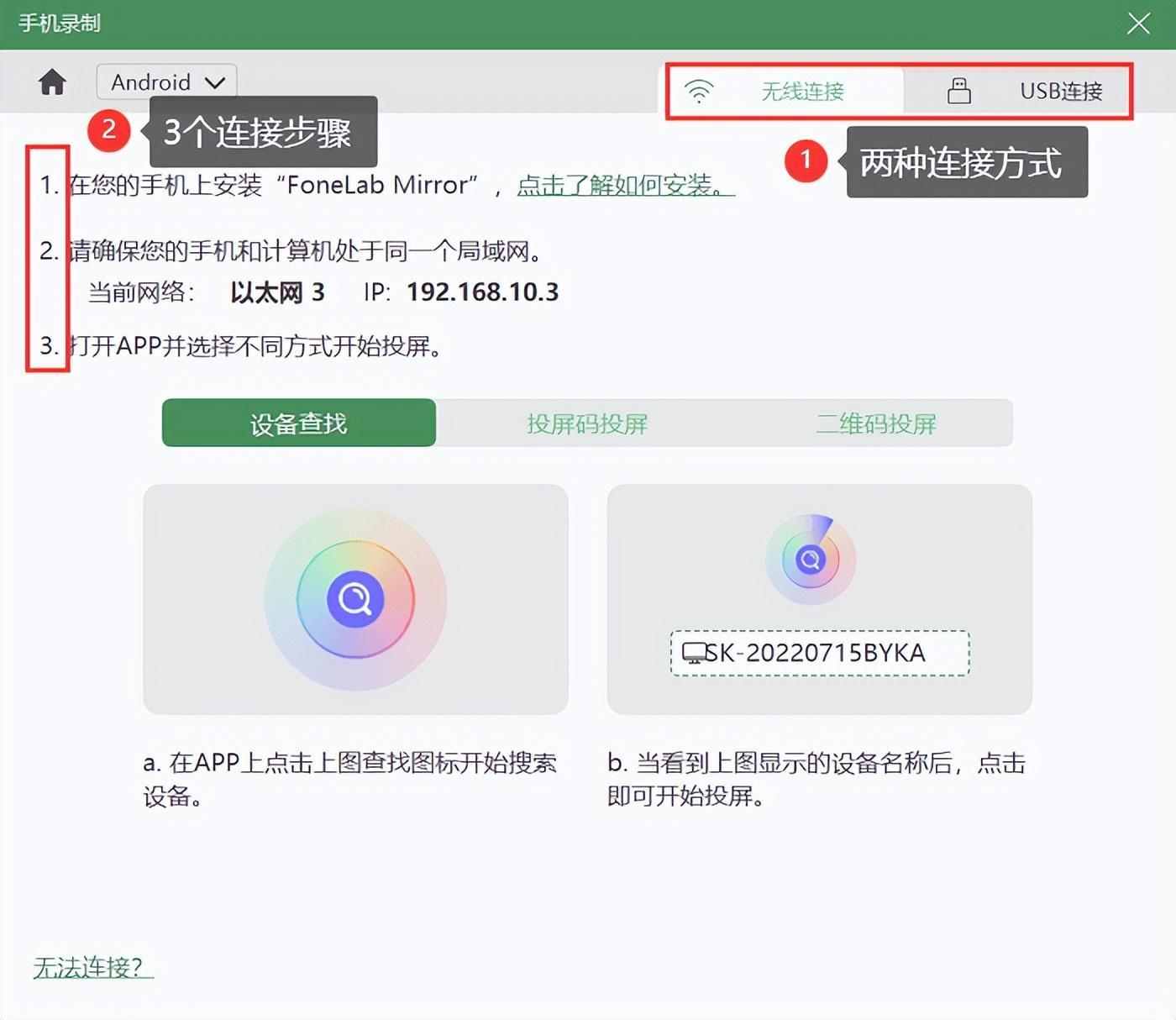第2步:进入“录手机”页面,记得选择安卓录制,连接方式有两种(无线连接与USB连接),推荐使用USB进行连接,把安卓手机投屏到电脑上。