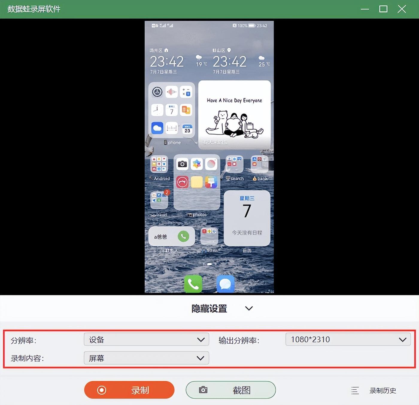 第3步:在开始录制屏幕之前,我们可以在页面对分辨率、输出分辨率、录制内容进行调整,准备完毕后,就可以录制我们的安卓手机了。