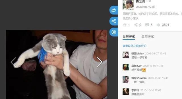 这要从娄艺潇还是个学生时说起,2008年,她在人人主页发了一个男生亲猫的照片。并直言:他总是出去拍戏,没法回来照顾猫,有不好意思给我长期寄养,猫猫就夭折了。