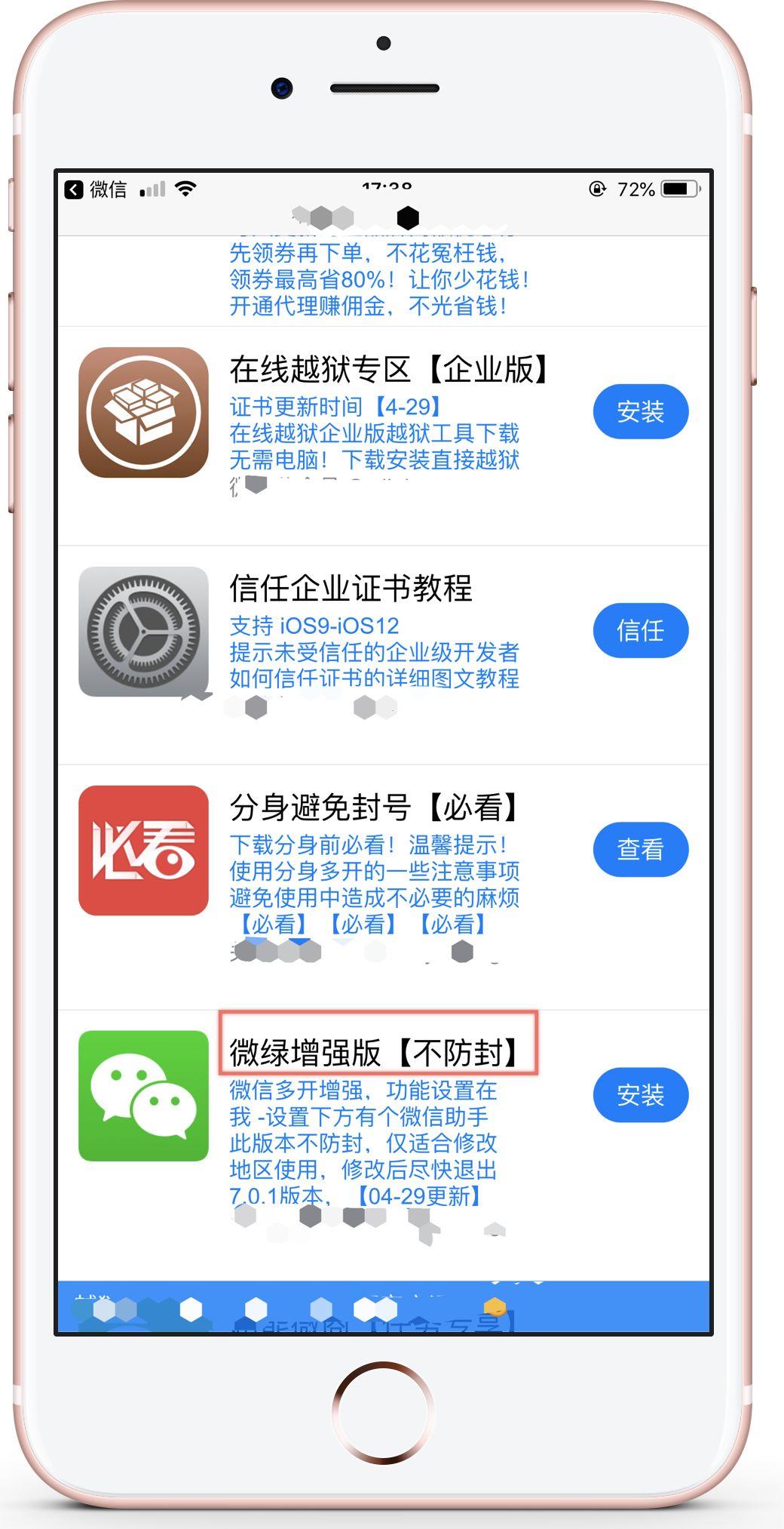 进来以后,找到「微绿增强版【不防封】」点击安装,安装成功后,点击会提示「未受信任的开发者」