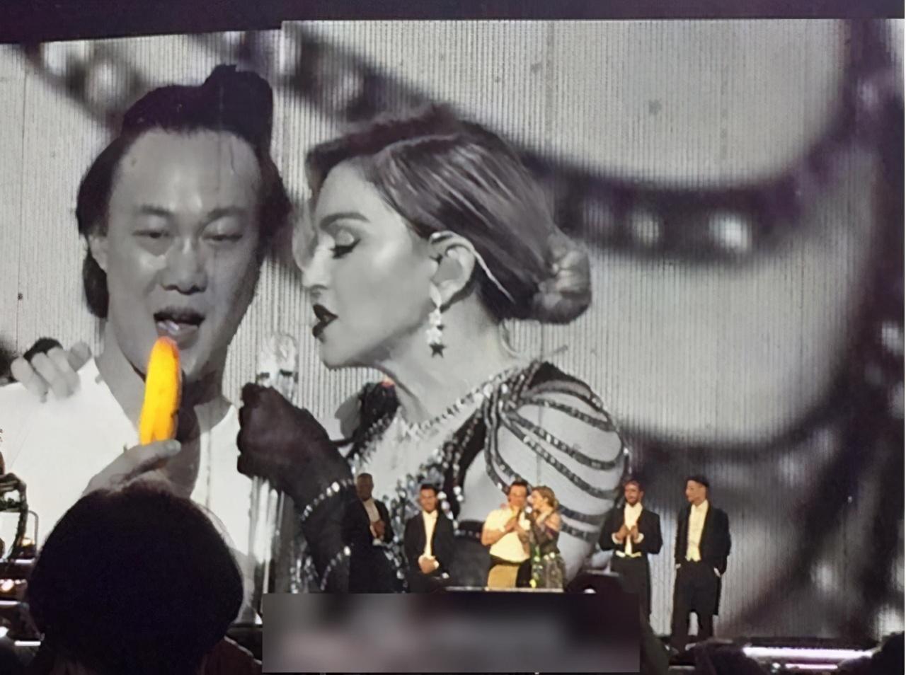 麦当娜演唱会陈奕迅被当歌迷邀上台,两人亲密互动,拿香蕉开玩笑