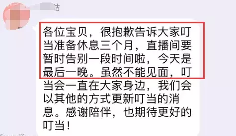与此同时有一张XDD粉丝群聊天记录截图流出,图中这哥们称小叮当准备休息三个月,直播间要暂时告别一段时间,今天是最后一晚。他坦言虽然不能见面,但XDD会一直在大家身边,会以其他的方式更新叮当的消息。最后向大家的陪伴表示感谢。