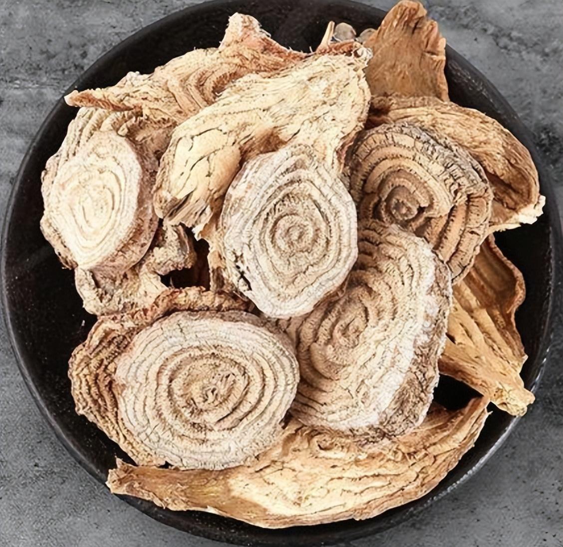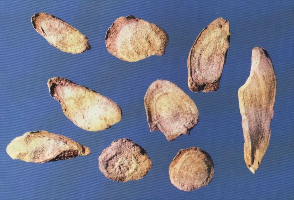 3、山莨菪:为茄科植物山茛菪Anisodustanguticus(Maxim.)Pasch.的干燥根。本品常横切或纵切成厚片。直径5~8cm,厚0.5~0.8cm。外皮灰黄至灰棕色,粗糙。切面灰黄色。质硬,折断呈粉性。皮部薄,色稍深,木部发达,色稍浅,有5~10轮密集的环状纹理。气微,味苦。
