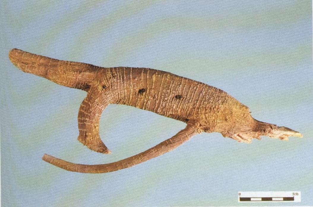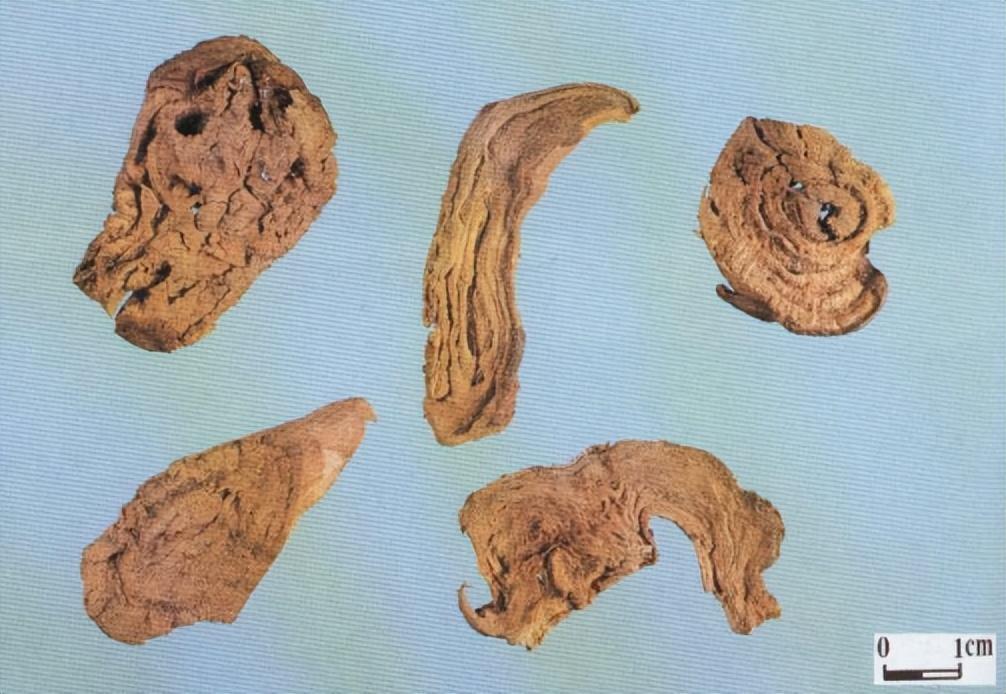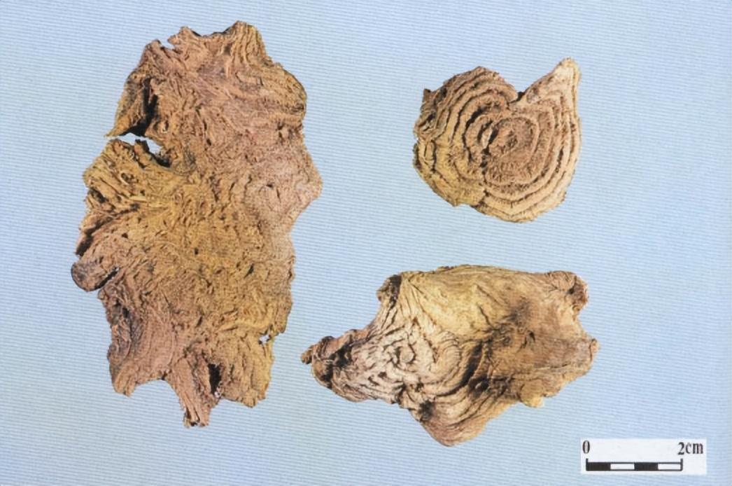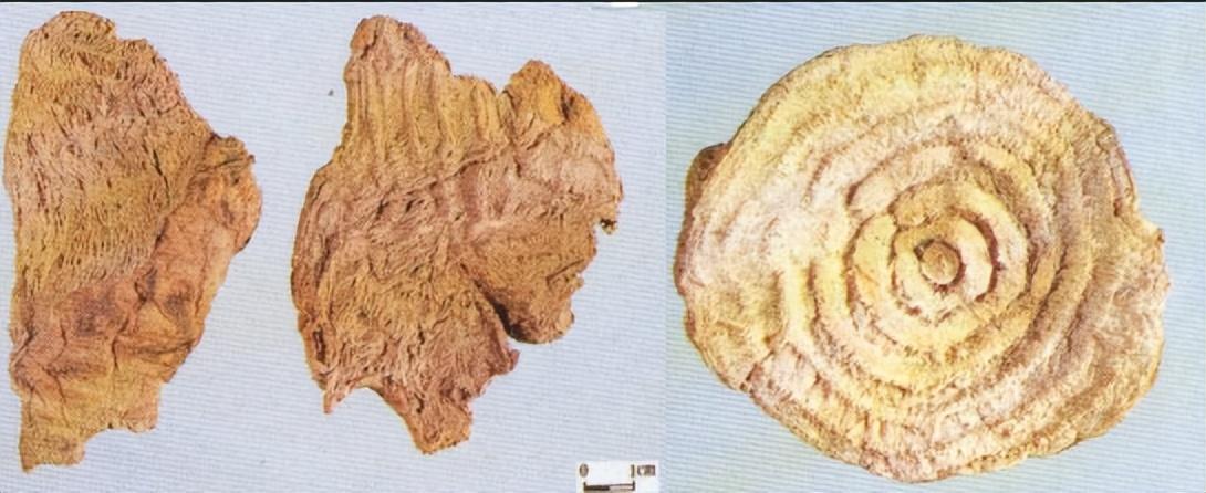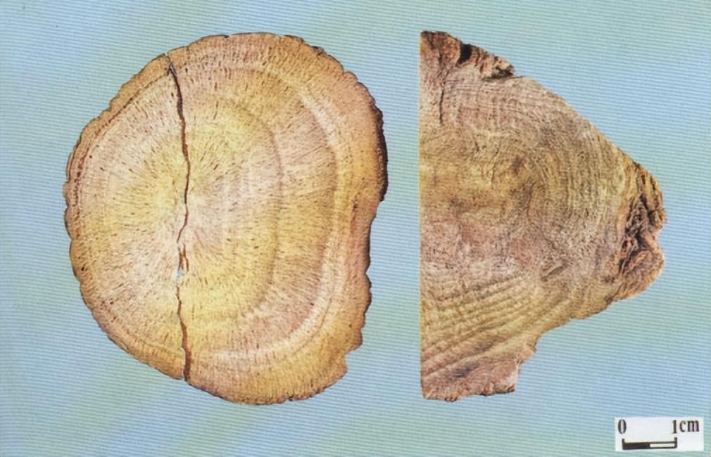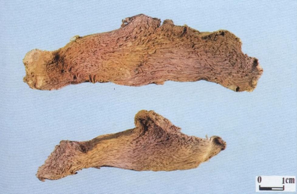 【性状】 本品为横切或纵切的不规则块片,厚薄不等。外皮灰黄色或灰棕色。横切片弯曲不平,边缘皱缩,直径2~8cm;切面浅黄棕色或黄白色,木部隆起,形成数个突起的同心性环轮。纵切片弯曲或卷曲,长5~8cm,宽1~2cm,木部呈平行条状突起。质硬。气微,味稍甜,久嚼麻舌。