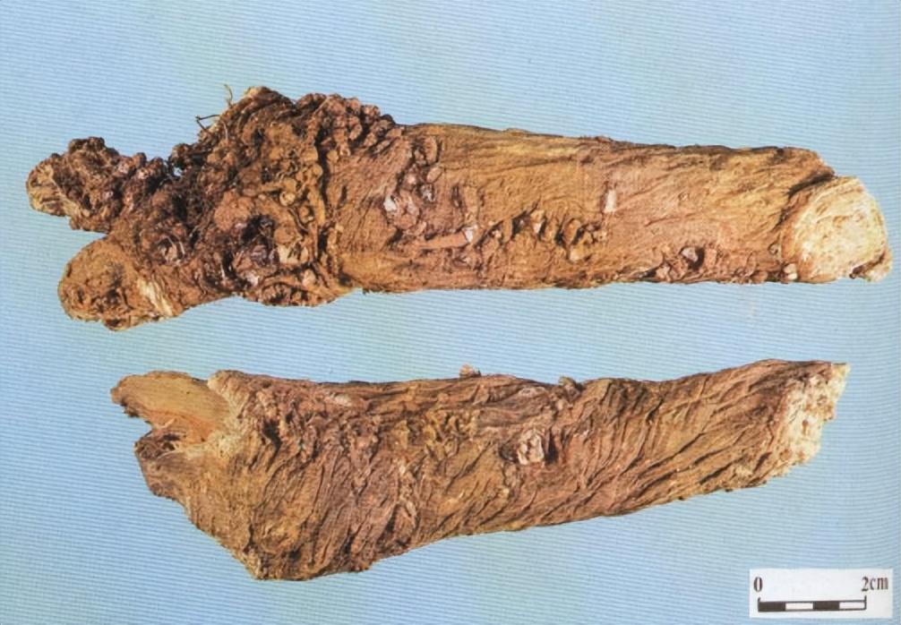 2、丝石竹:为石竹科植物北丝石竹Gypsopyiladahurica Turcz.ex Fenzl.的干燥根。本品粗大,呈圆柱形,上粗下细,多扭曲。长约20cm,直径3-7cm。根头部留有多数残茎痕,外皮黄棕色,易剥落。质硬,不易折断,断面类白色,不平坦,可见2~3轮环状纹理。