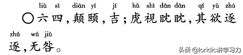 六四,颠倒颐养方式,吉祥;虎视眈眈,他的欲望源源不断,没有灾祸。